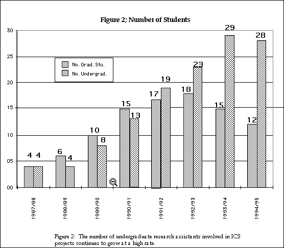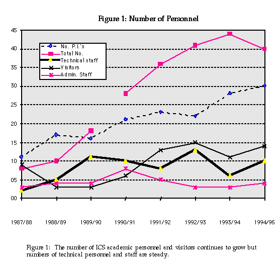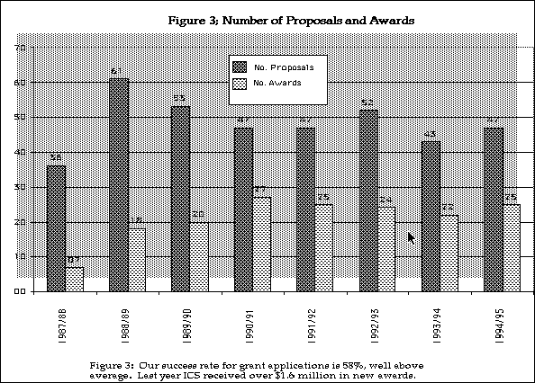 This past year ICS researchers worked on 36 projects all over the world, from Alaska to Antarctica. We now count 30 in our scientific staff, which represents a steady increase. But student membership has exploded (Fig. 1). We were awarded 25 grants this year against previous submissions of 43 requests; this amounts to a success rate of 58%. New awards amounted to $1.6 million this year. During 1994/95 our scientists submitted or published 39 scientific papers. ICS researchers presented papers at the annual meetings of the American Geophysical Union, the Geological Society of America, and the Seismological Society of America.