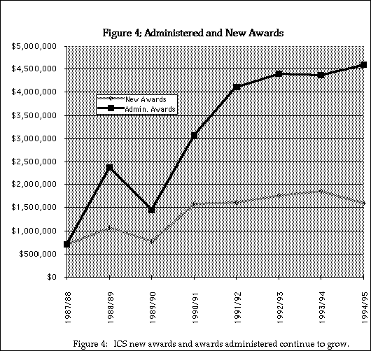 Our award success rate of 58% is well above the national averages of 25% to 35% in Earth Sciences. We continue to show overall growth in the dollar amount of new awards received and awards administered (Figure 4). After the dramatic growth in our first four years, the rate has leveled to about 10% per year.