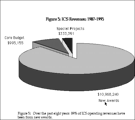ICS operates on both internal and extramural revenues. UCSB funds include core operating budget, and special project awards. The cumulative revenues of ICS for the past 8 years are $12.3 million (Figure 5). New awards to UCSB from extramural agencies comprise $11 million or 89% of total revenues.