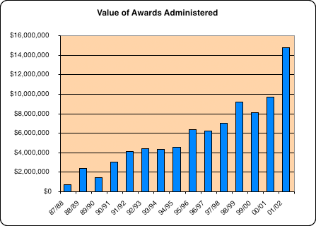 This year we experienced a high volume of administered awards . Administered awards includes the total value of any award that the unit had to administer during the fiscal year including proposals that are closed by the unit during the fiscal year.