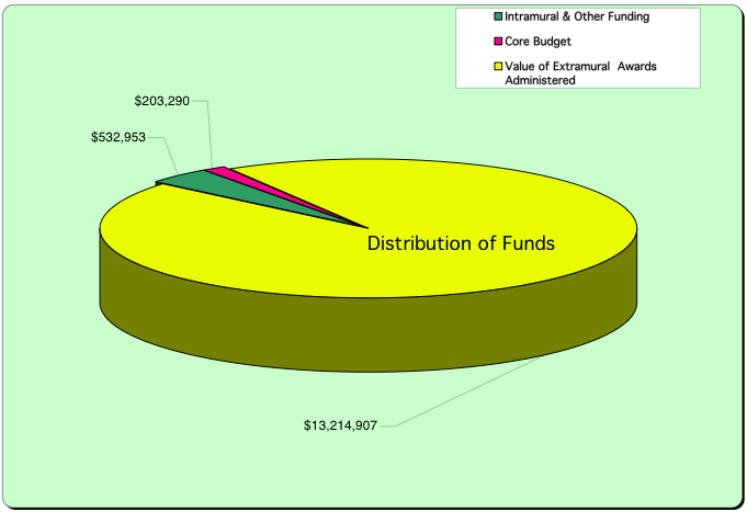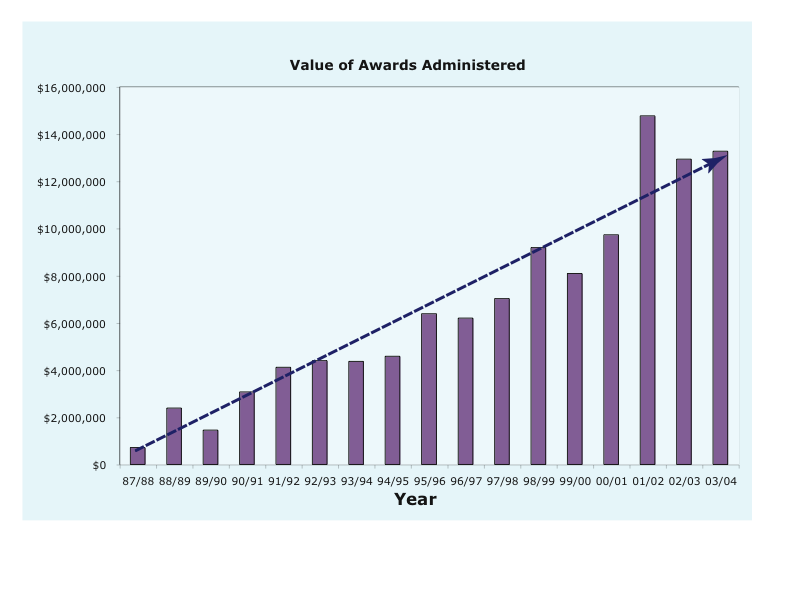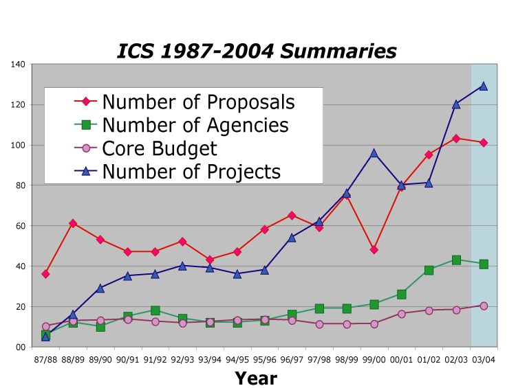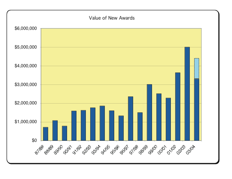 Value of new ICS research awards (dark blue bars) since 1987. 2003-2004 marks a decrease from the previous year when a $2M grant was received. The light blue bar represents the funding that came into and then went out of ICS as 6 researchers departed for faculty jobs or researcher scientist jobs elsewhere.