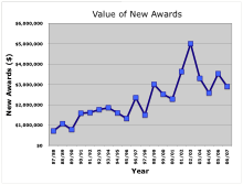 measures of activity, such as the number of projects administered, the number of agencies to which grants are submitted, and the number of new awards remained steady or showed modest increases. Whereas the success rate of proposals has increased to ~60% over the past 4 years, the fraction of the total funding requests that were approved for funding has dropped to ~20%, i.e., fewer of the large ICS grant requests are being funded.